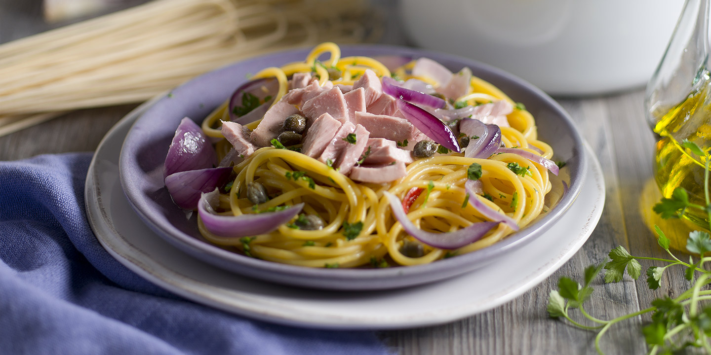3. Dans une grande poêle, faire revenir l’ail, l’oignon et le piment dans de l’huile. Ajoutez les câpres et le thon et un peu de son huile d’olive.
