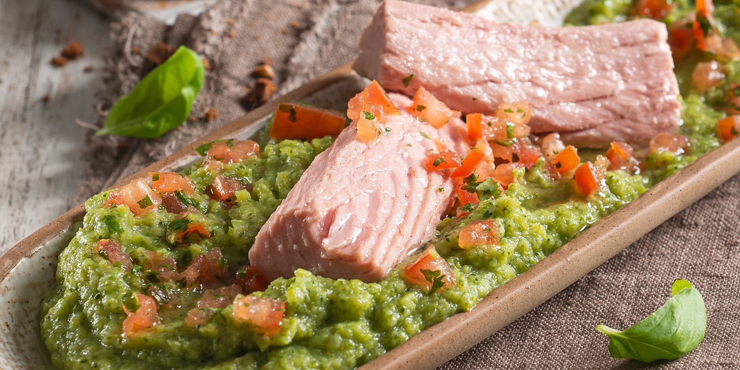 4. Répartissez dans quatre assiettes la sauce aux brocolis, disposez-y les filets de thon égouttés, divisés également, et terminez avec les dés de tomates et leur assaisonnement.