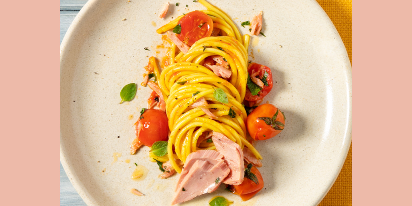 5. Versez les pâtes égouttées dans la sauce et ajoutez un peu d’eau de cuisson, remuez le tout pendant deux minutes maximum pour obtenir une sauce crémeuse et servez les pâtes dans des assiettes. Garnissez chaque assiette d’un filet de thon et d’un peu de sauce aux olives et aux tomates cerises.