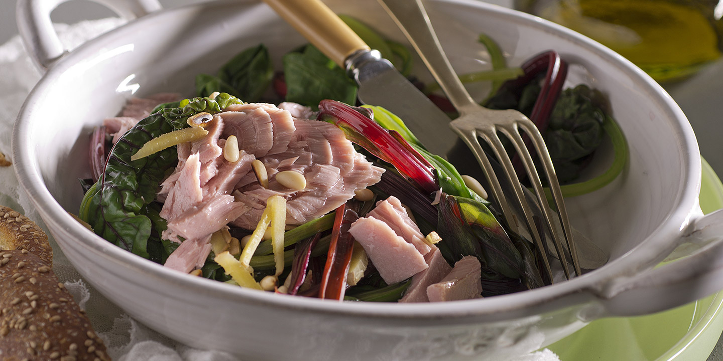 3. Retirez l’ail, déposez les blettes sur une assiette, ajoutez le thon et accompagnez de pain toasté.